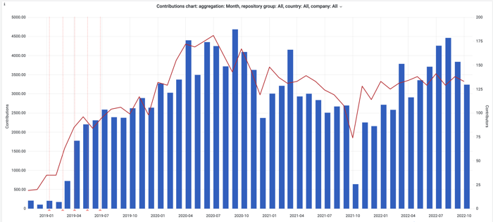 Contributions and contributors to Tekton Projects over time. Source devstats.
